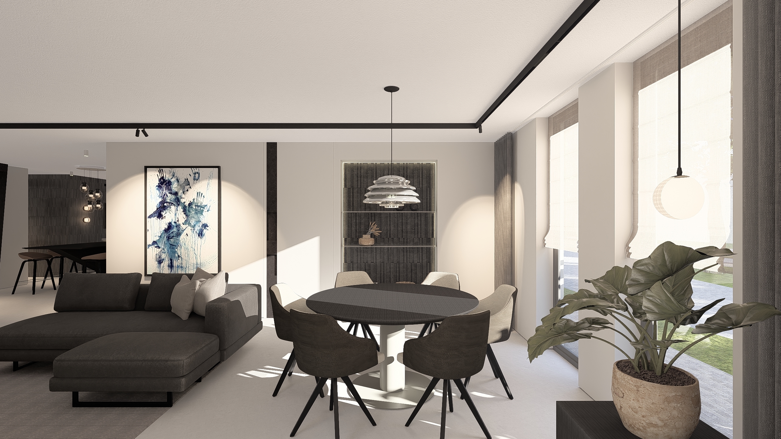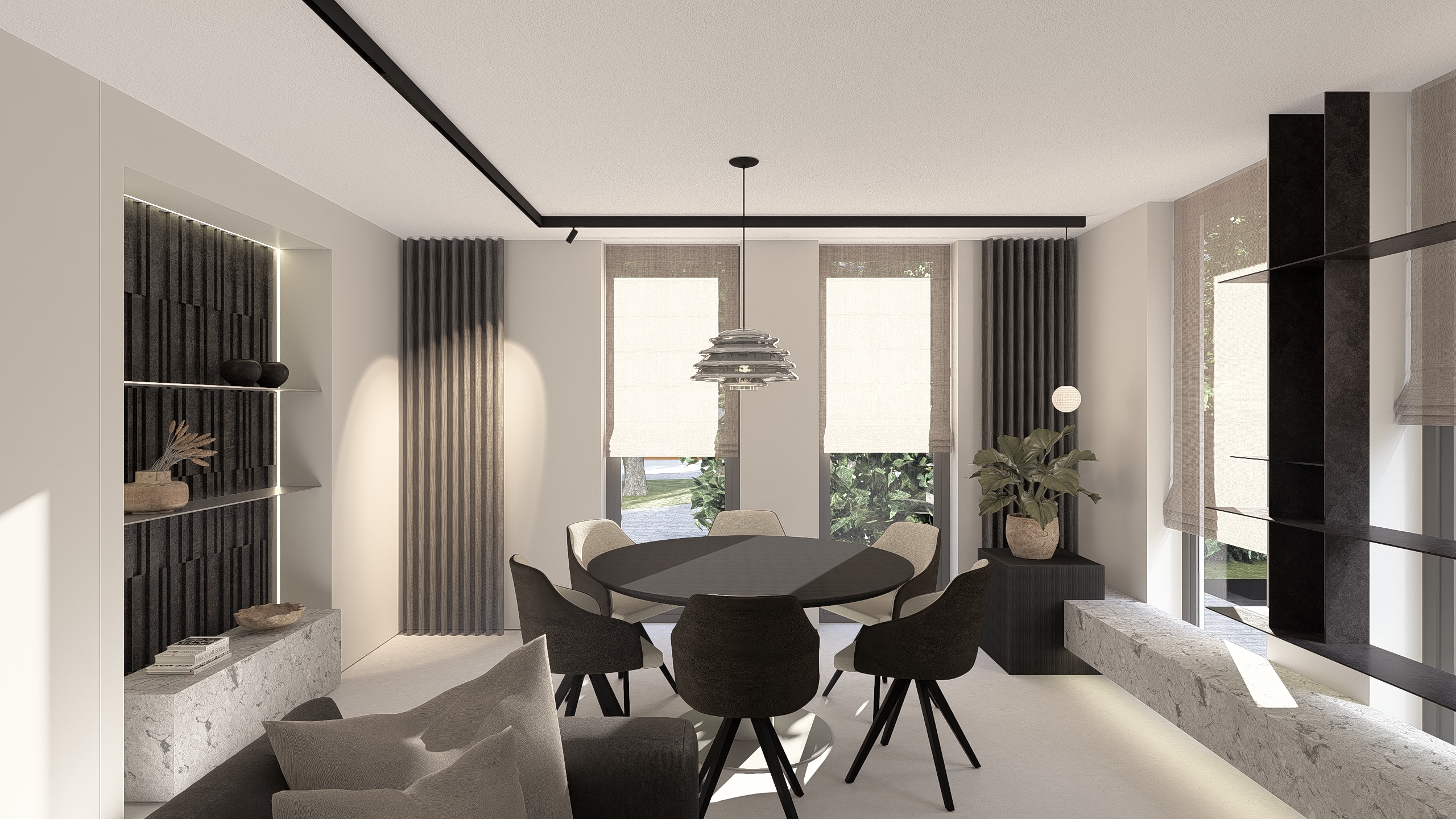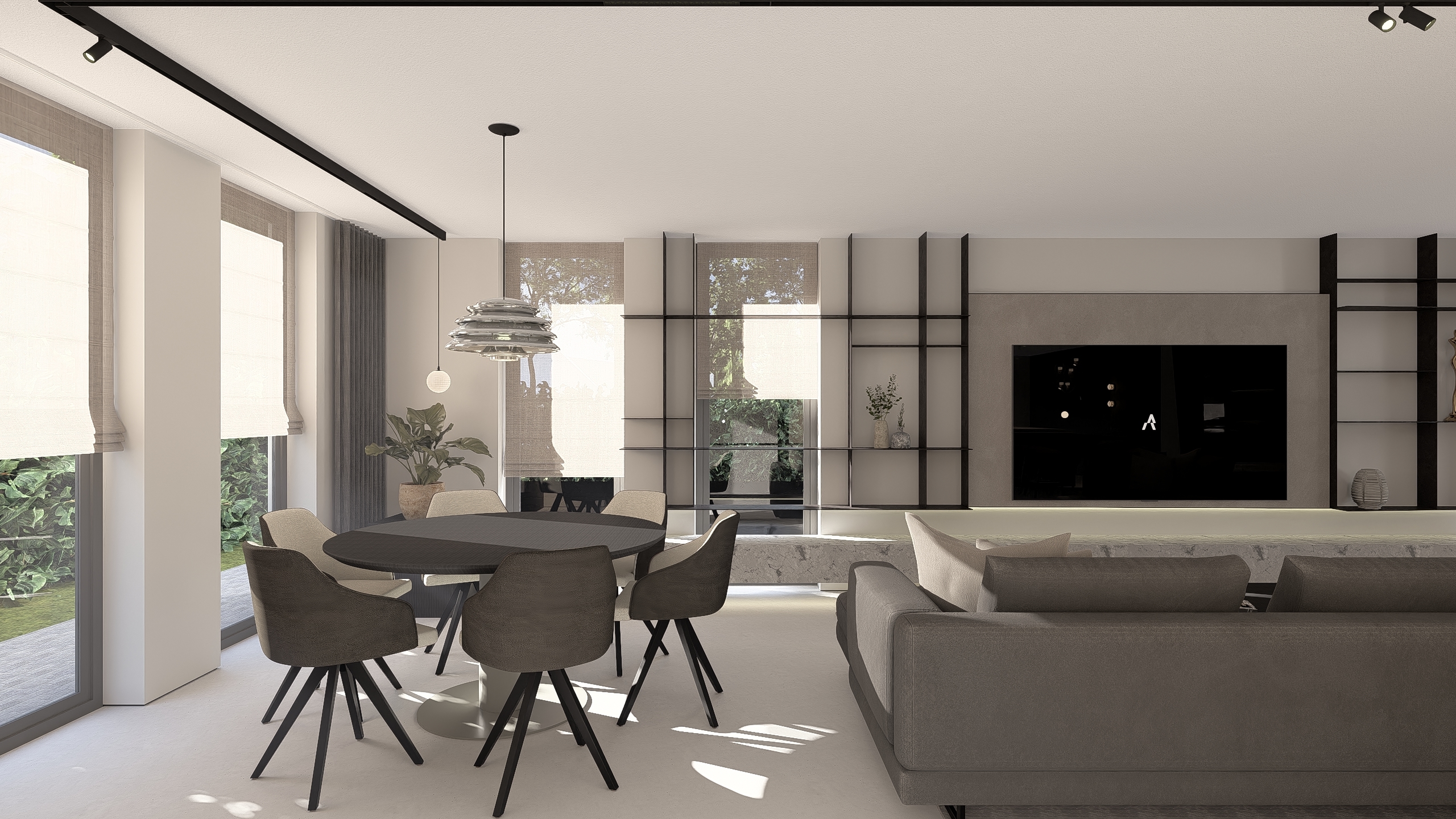 Achter een blinde deur ontvouwen zich de nieuwe leefruimtes. De serre, met haar gedurfde plafond, vormt een uitgesproken middelpunt en combineert een zacht palet met een verfijnde, luxe uitstraling.
