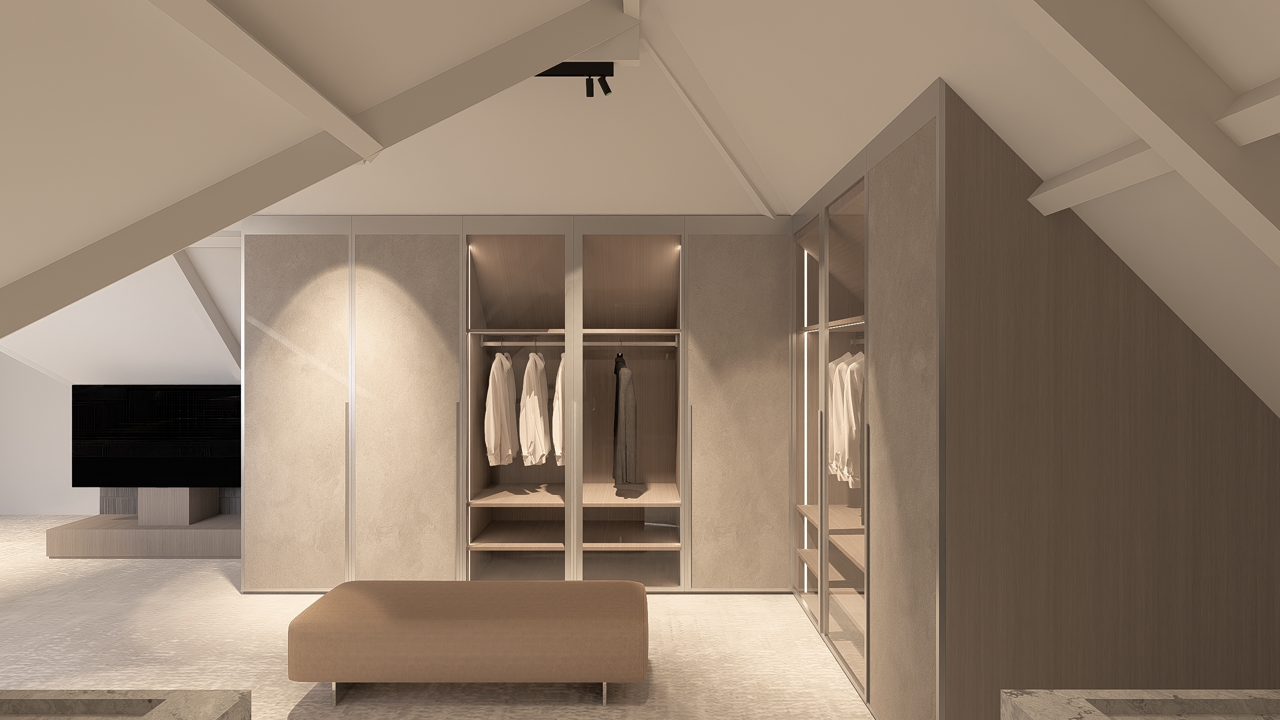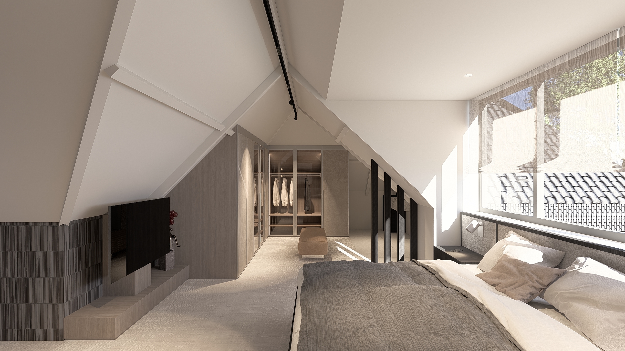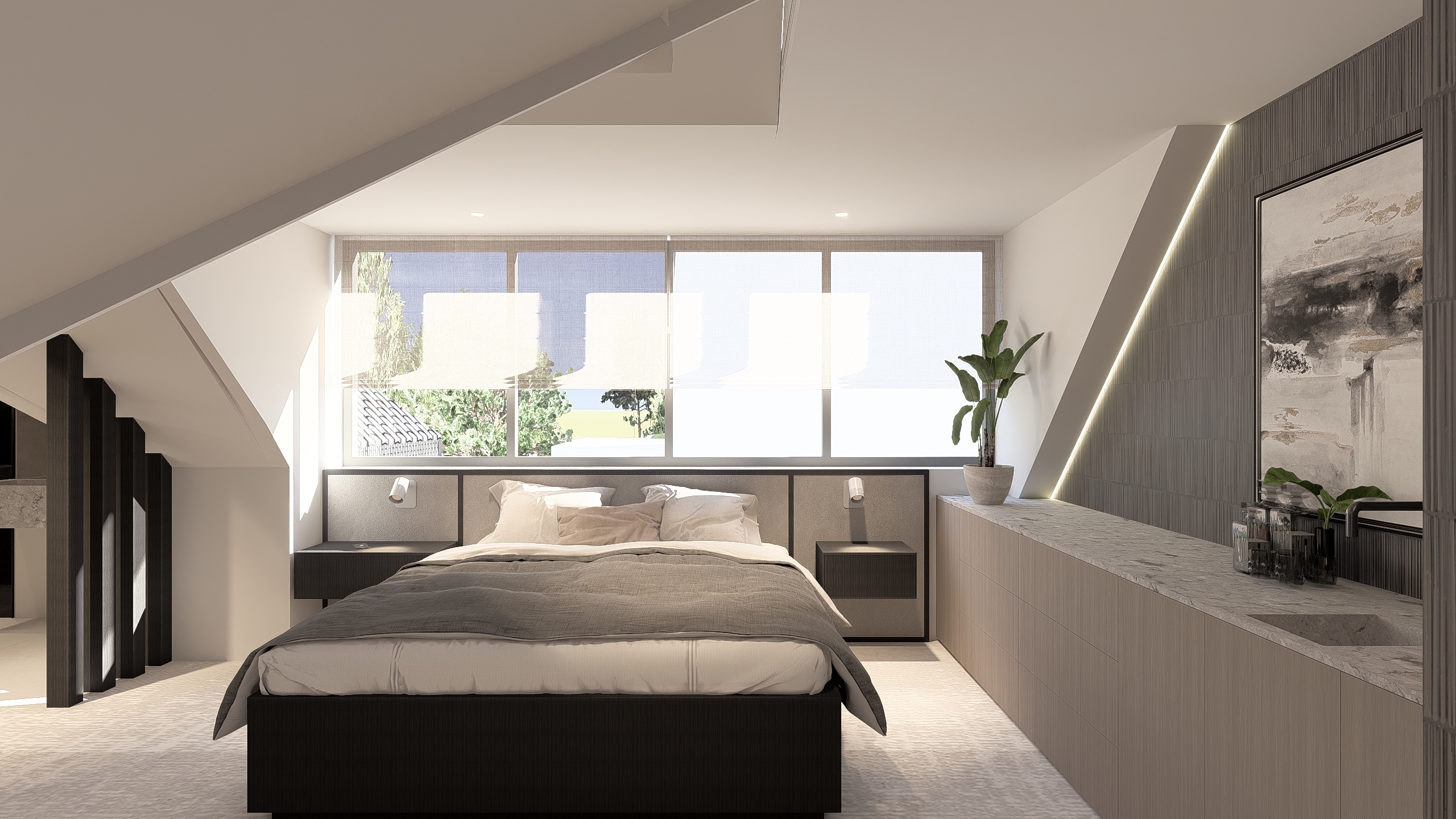 Achter een blinde deur ontvouwen zich de nieuwe leefruimtes. De serre, met haar gedurfde plafond, vormt een uitgesproken middelpunt en combineert een zacht palet met een verfijnde, luxe uitstraling.