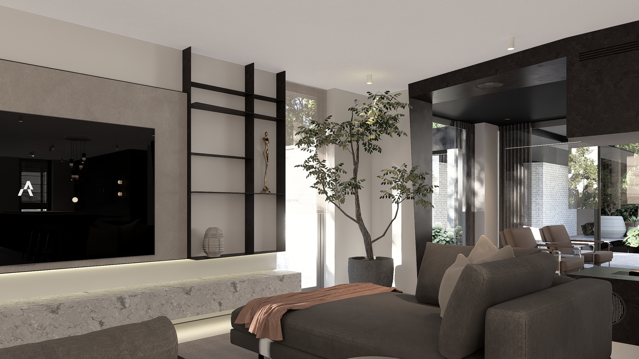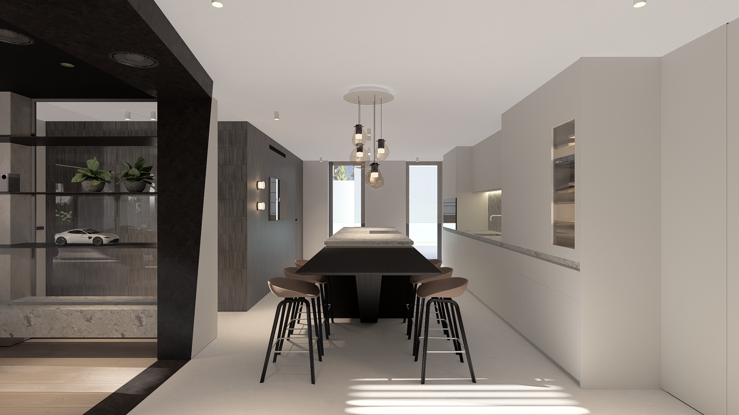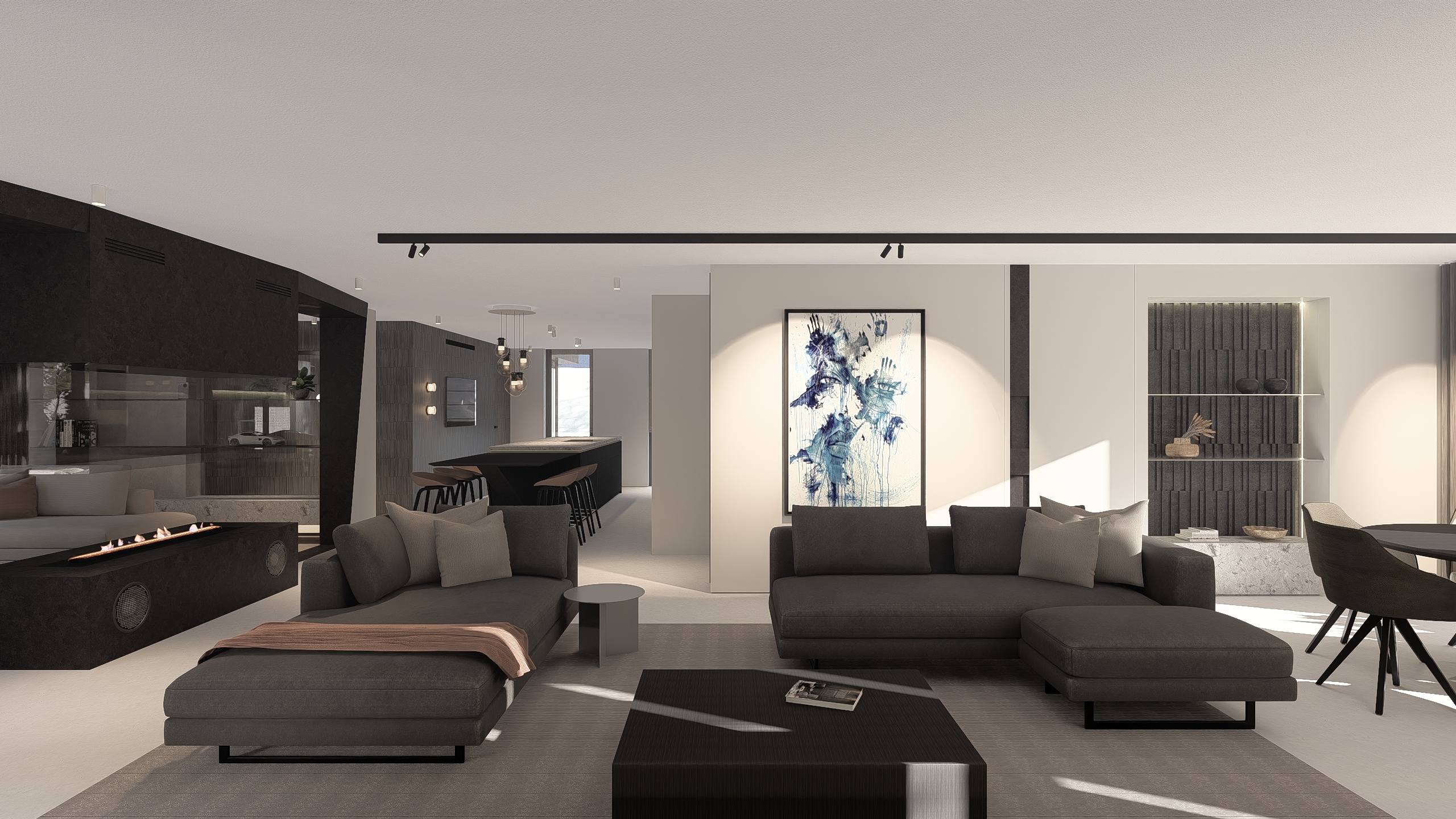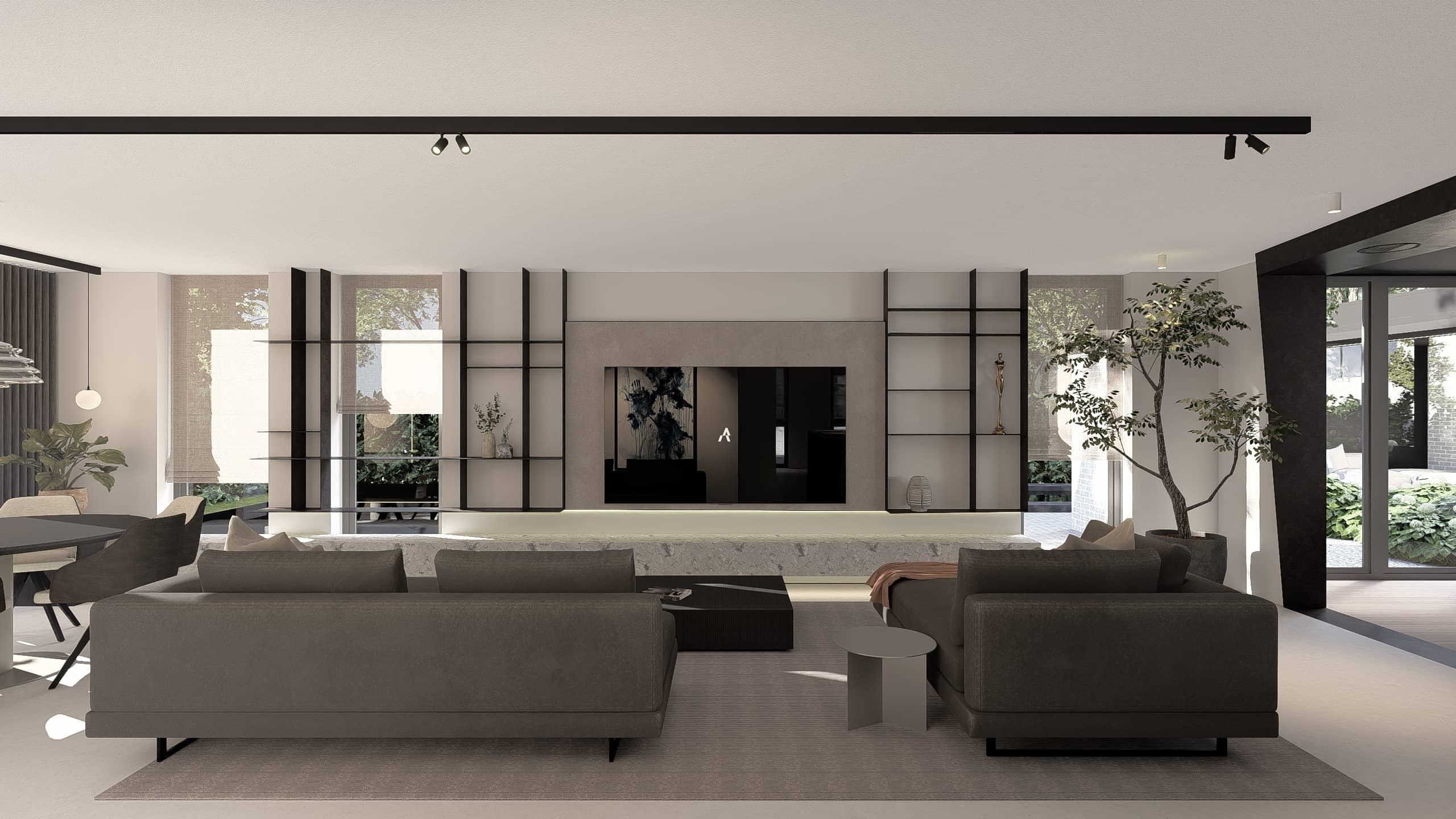 Een krachtig en deels futuristisch ontwerp, waarin een op maat gemaakt aquarium als eyecatcher fungeert en de woonkamer naadloos verbindt met de lounge.
