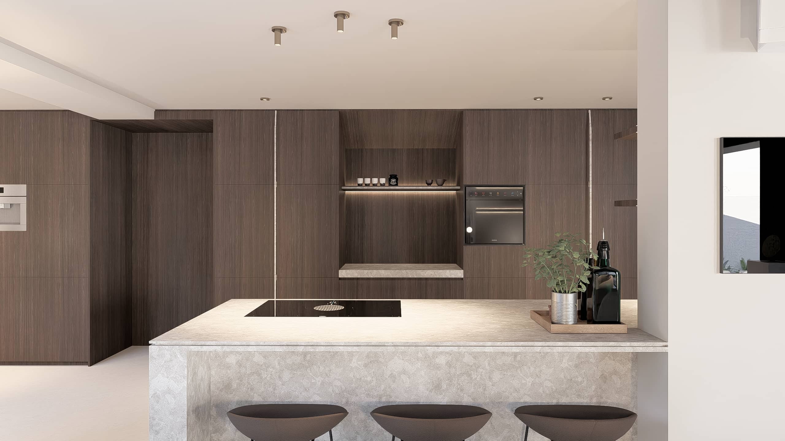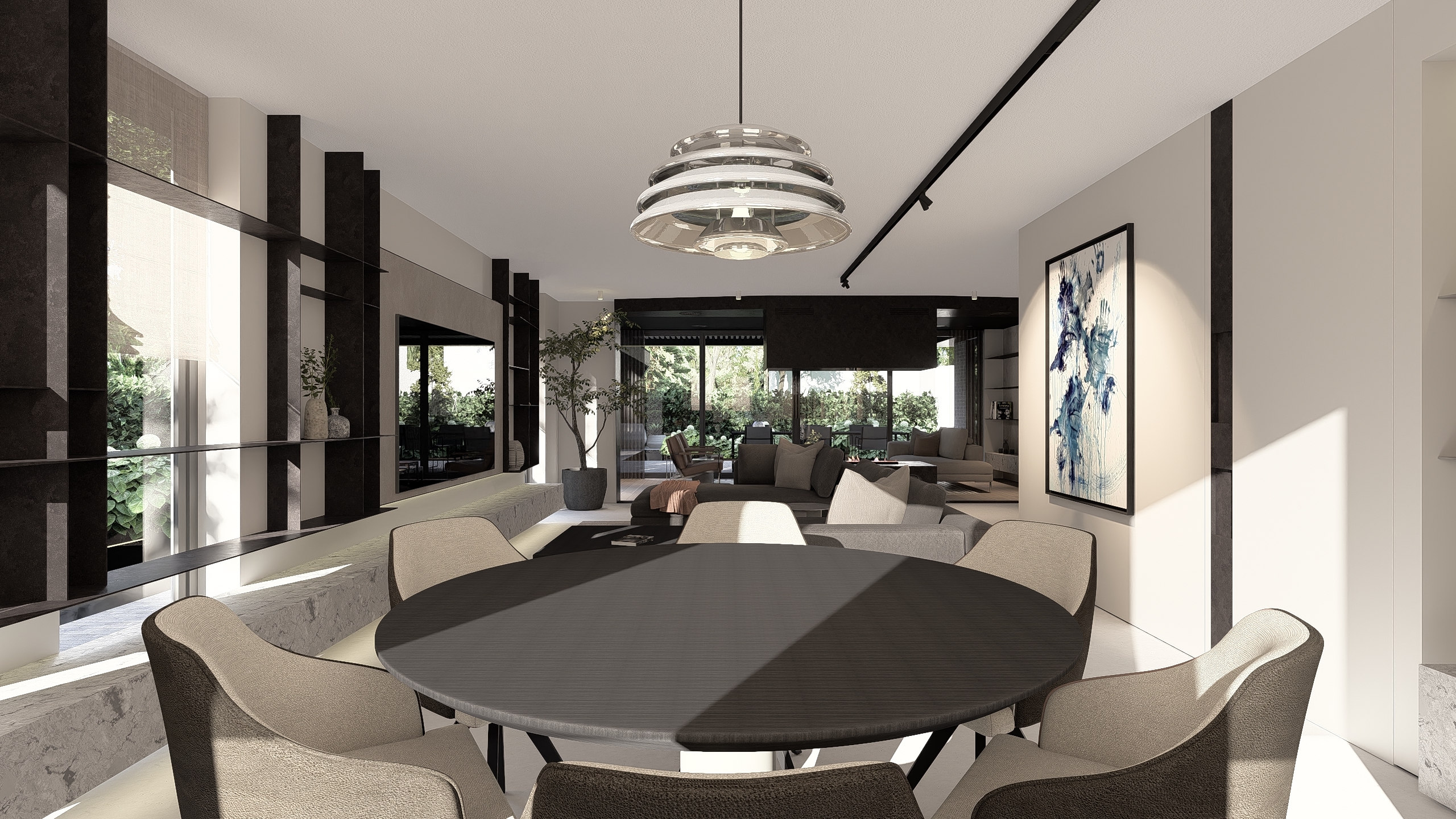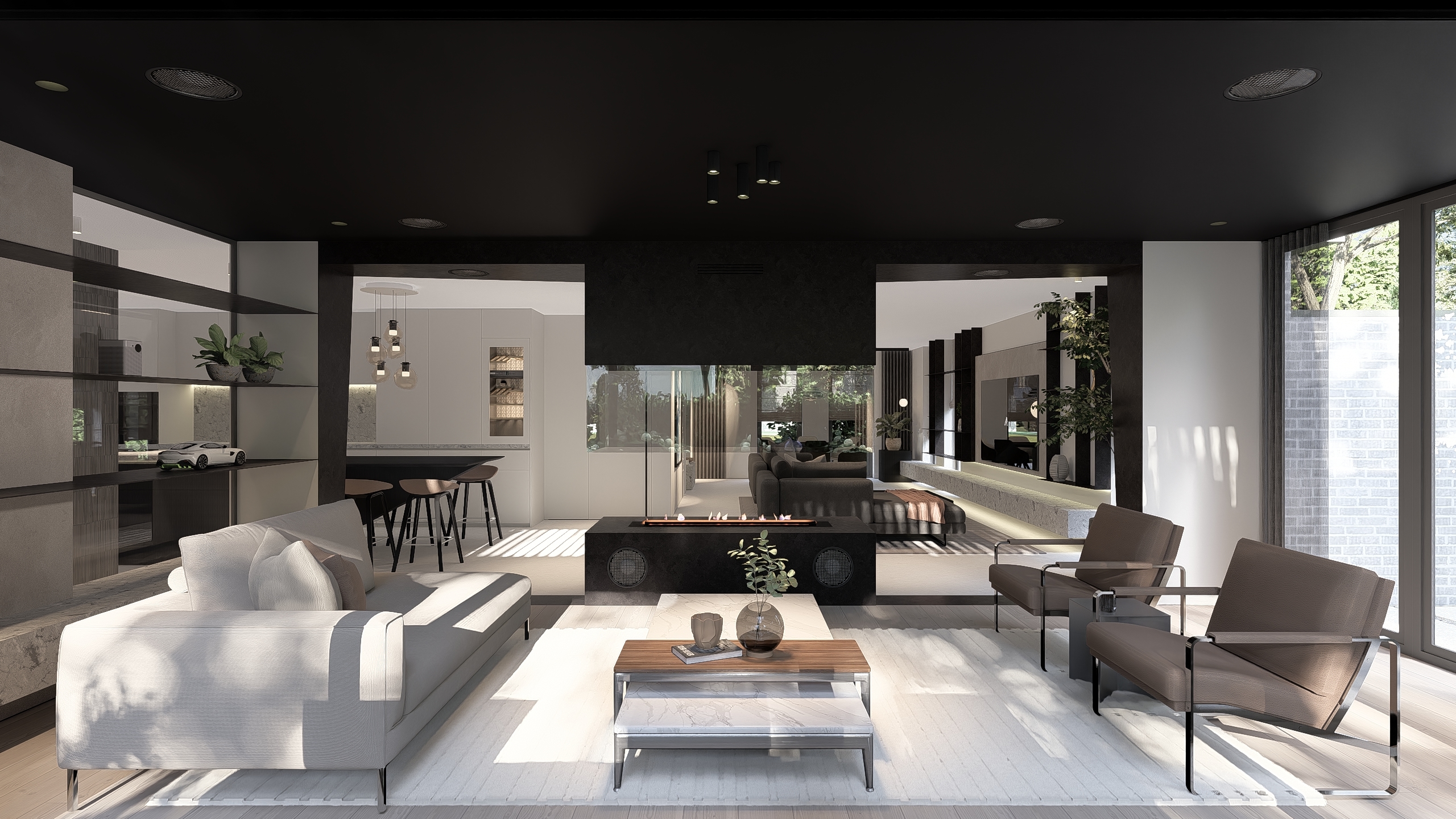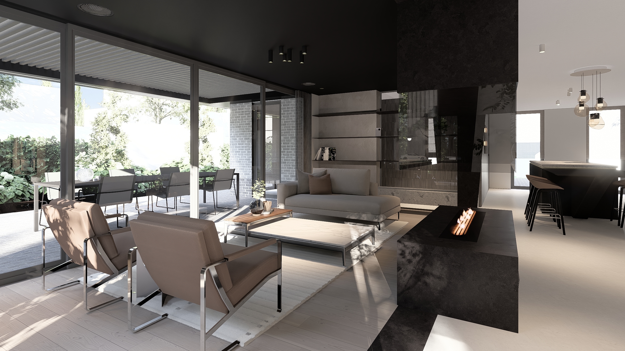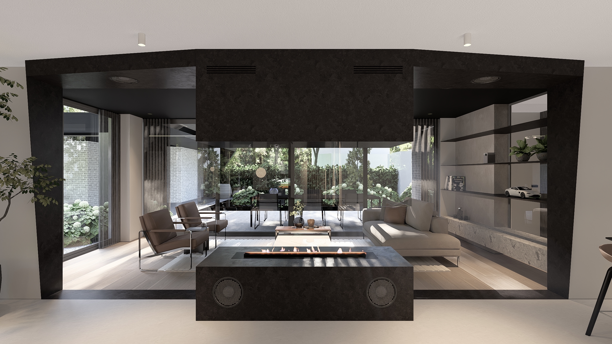 Een krachtig en deels futuristisch ontwerp, waarin een op maat gemaakt aquarium als eyecatcher fungeert en de woonkamer naadloos verbindt met de lounge.