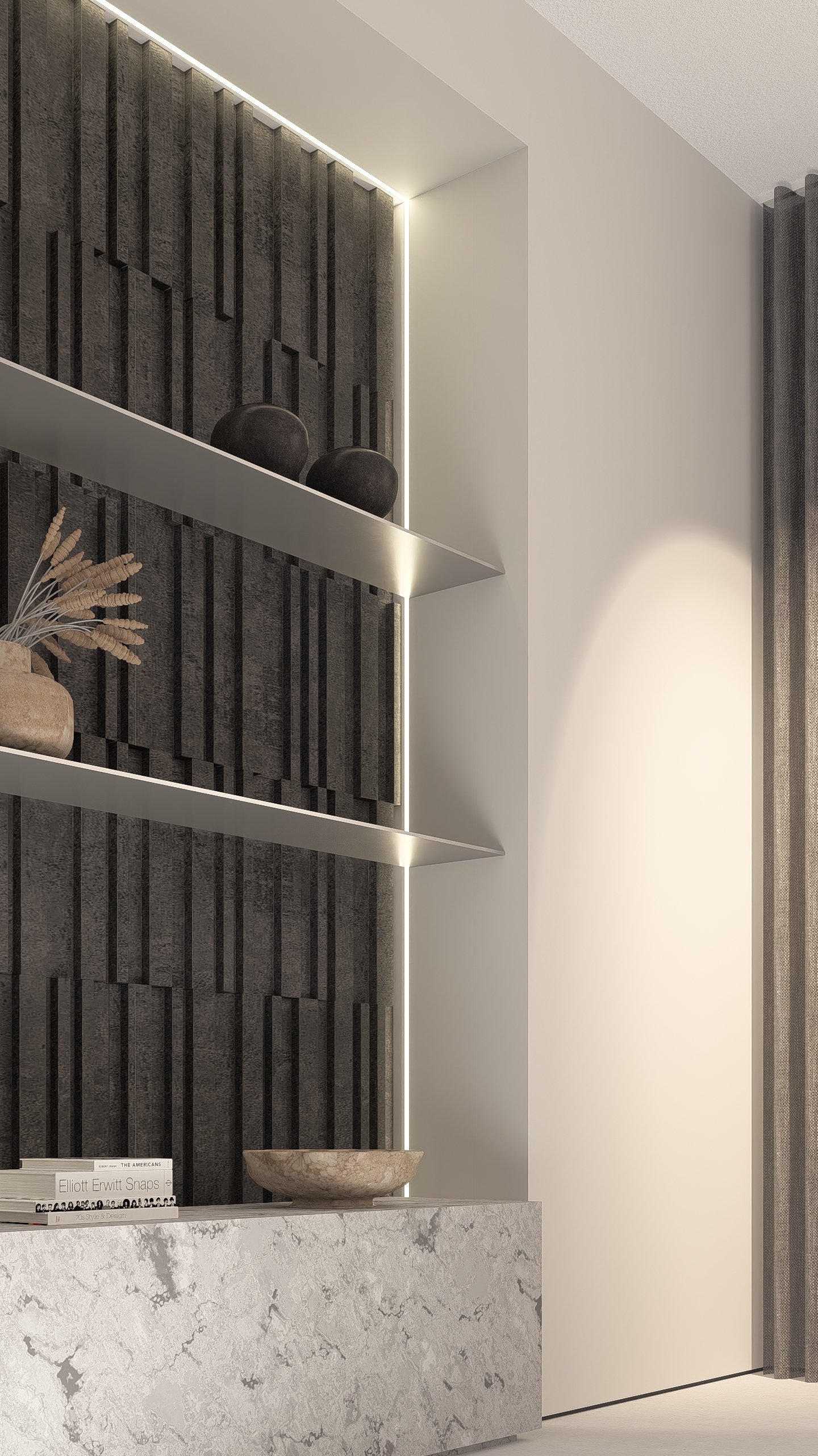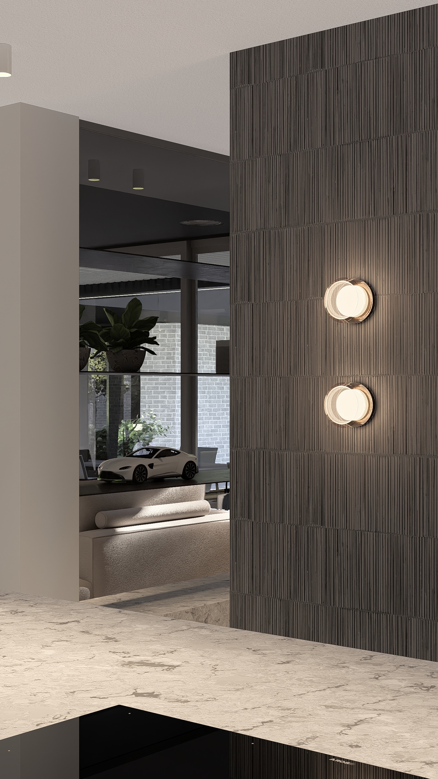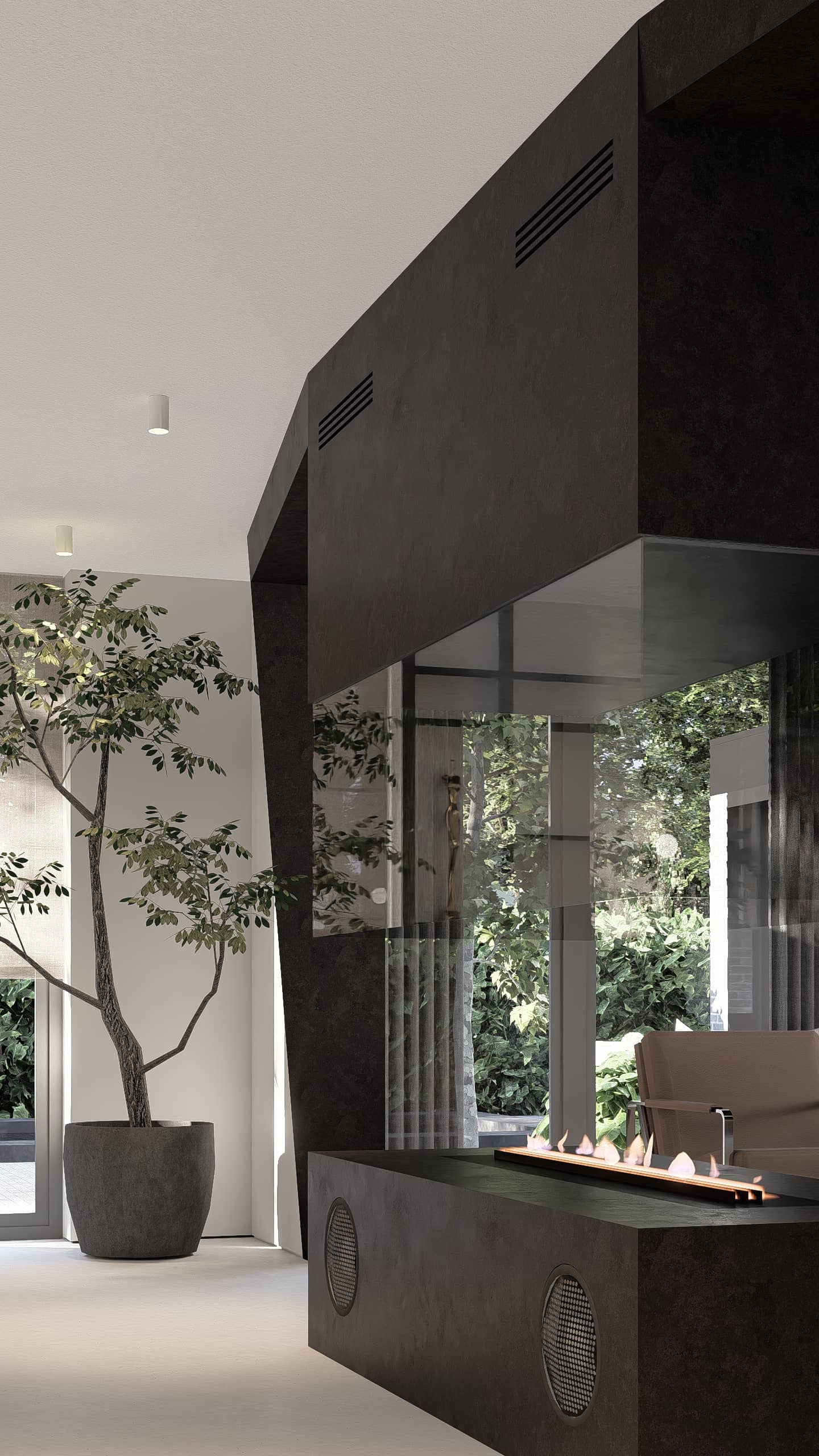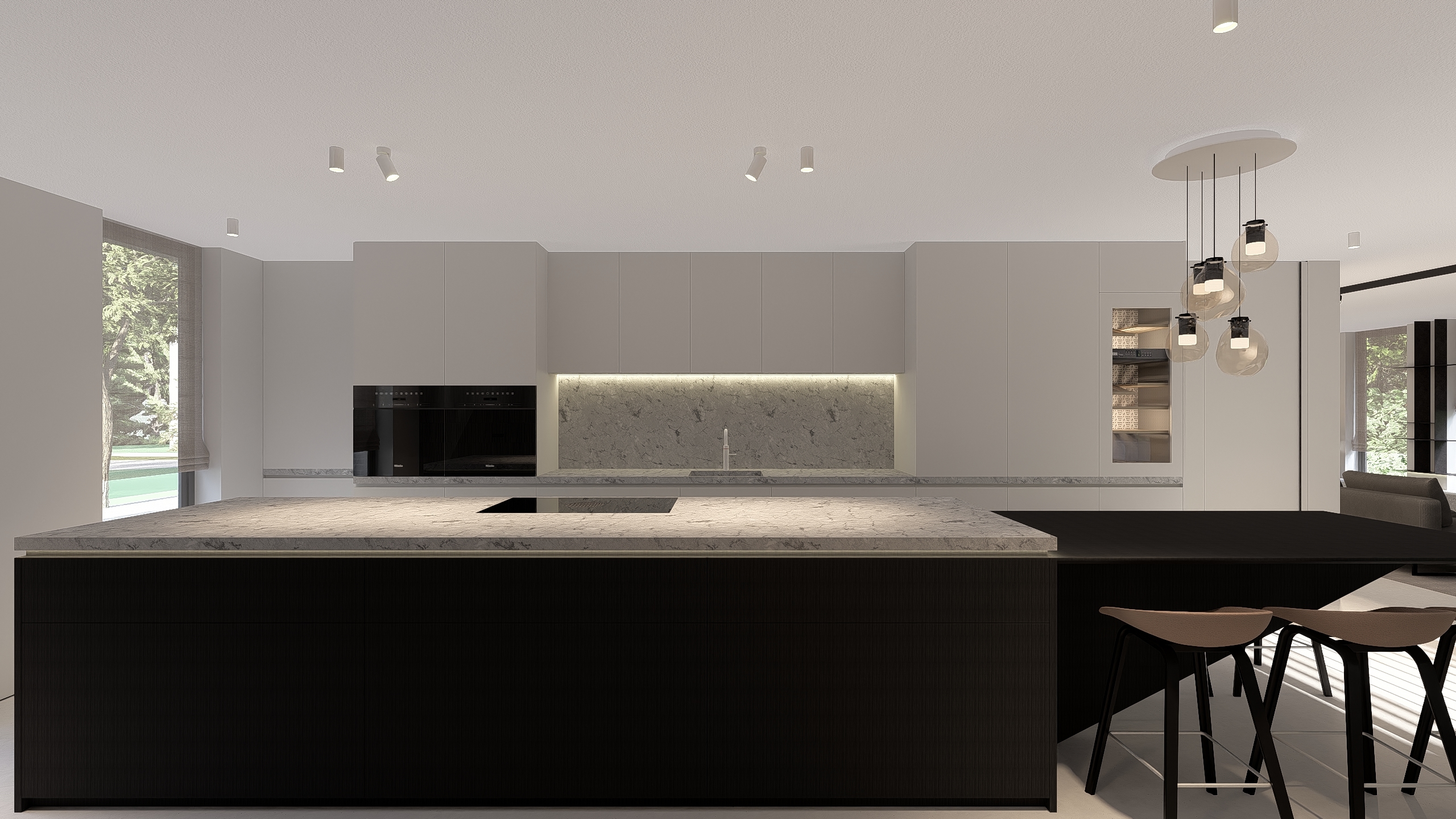 Een krachtig en deels futuristisch ontwerp, waarin een op maat gemaakt aquarium als eyecatcher fungeert en de woonkamer naadloos verbindt met de lounge.