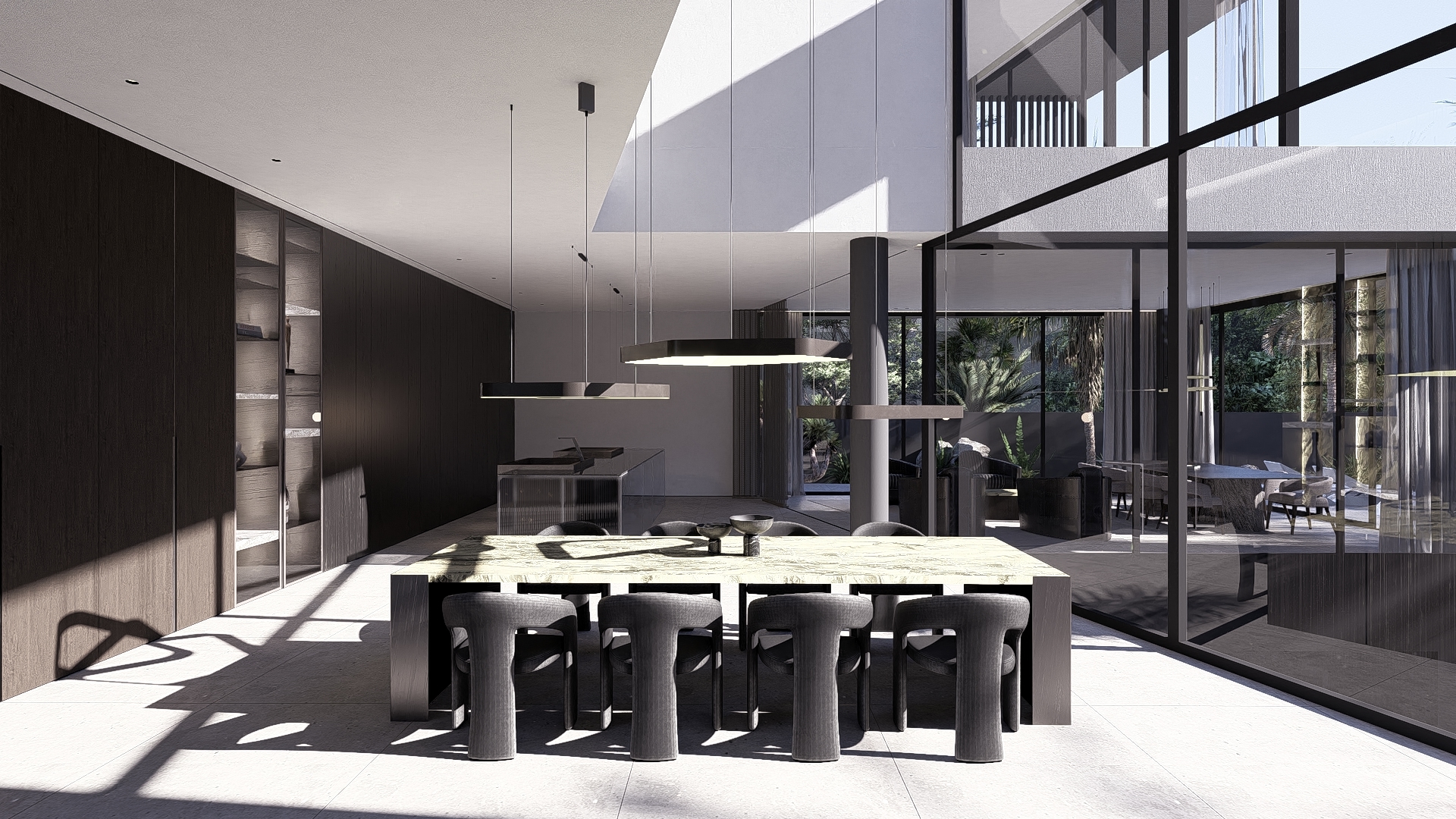 Dit interieur sluit perfect aan op de architectuur en de lijnen van het gebouw. Hierbij is gekozen voor hoogwaardige basismaterialen zoals roestvrij staal, marmer, geribbeld glas, en donker houtfineer, die samen een elegant en tijdloos geheel vormen. LED-lijnen en moderne verlichtingsarmaturen zorgen voor subtiele accenten en benadrukken de geometrische vormen in de ruimte. Het resultaat is een harmonieus interieur dat naadloos integreert met de architectonische visie van de villa, waarbij elke lijn en vorm zorgvuldig is uitgebalanceerd.
