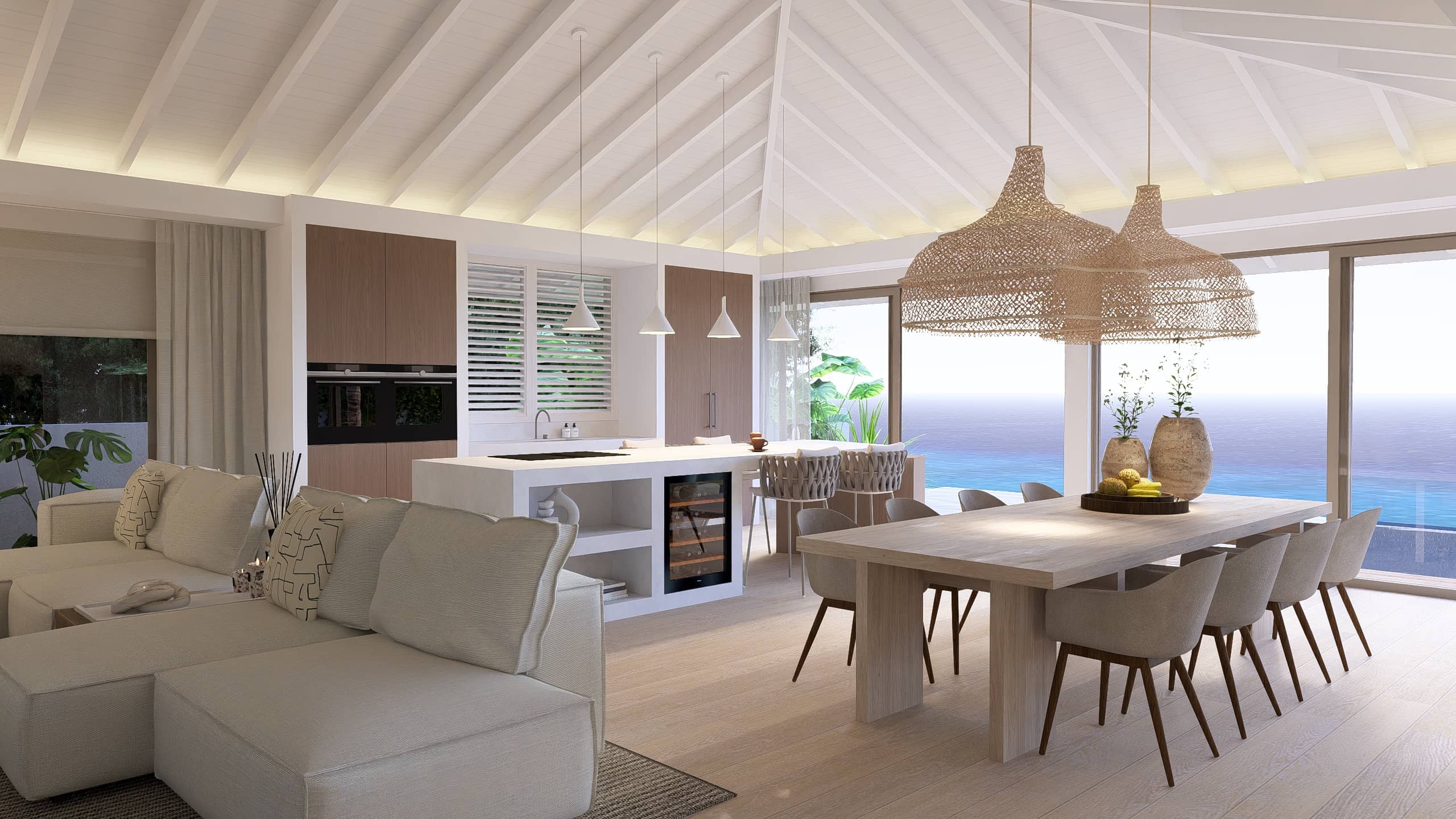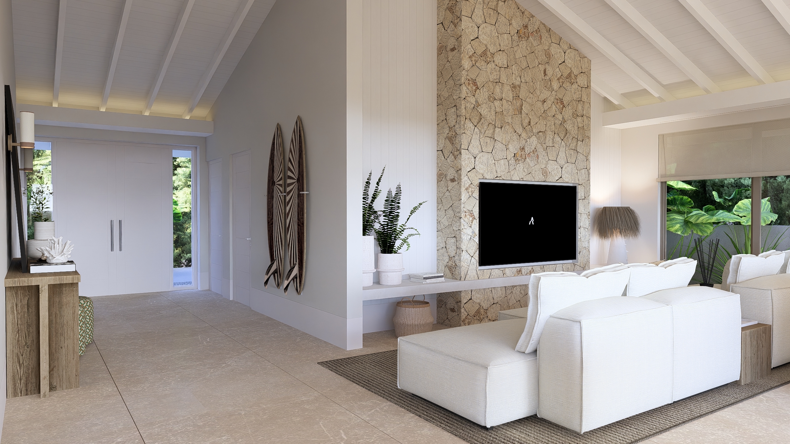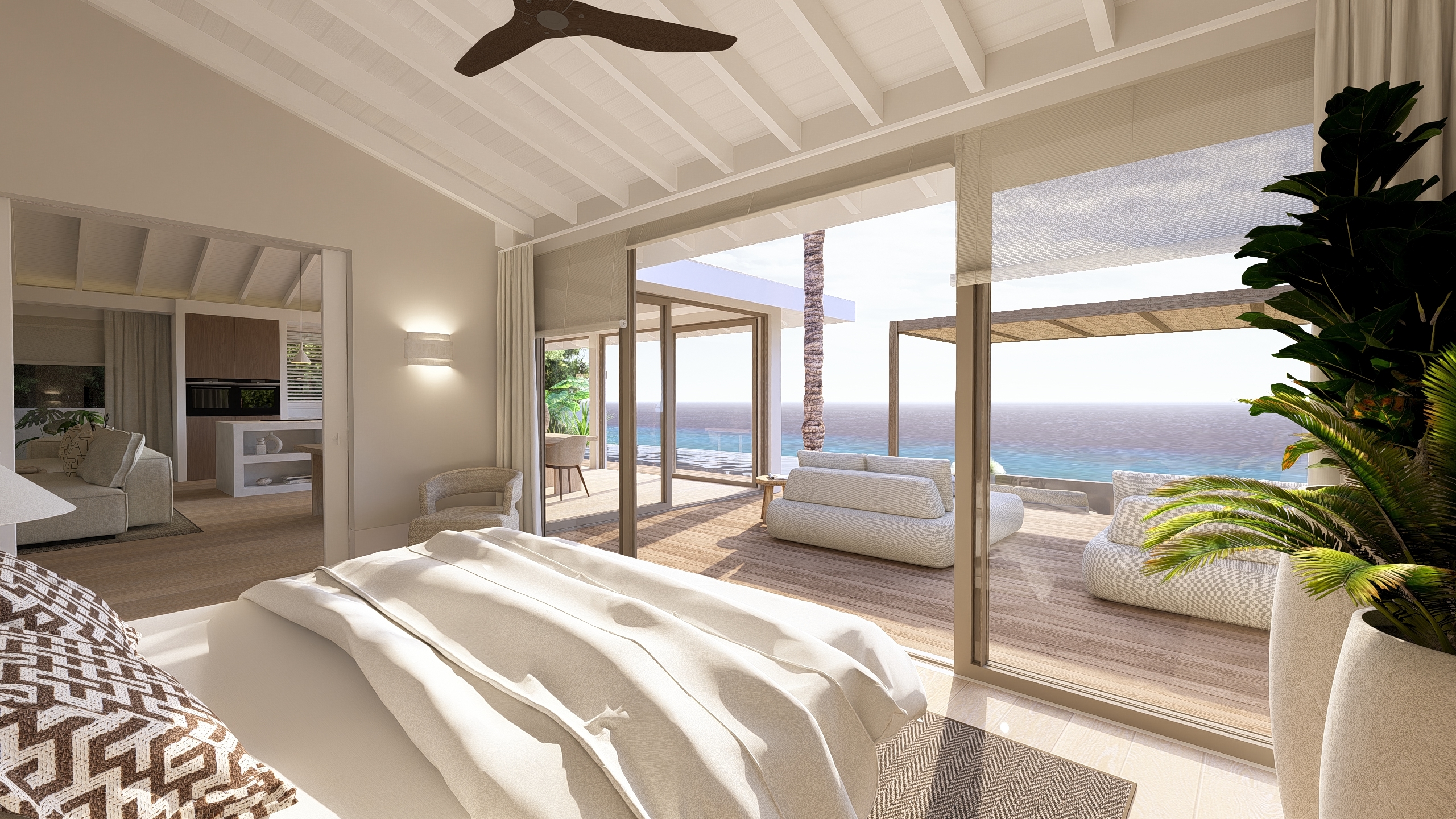 Natuurlijke materialen zoals hout, linnen en rotan vormen de basis van het ontwerp en worden gecombineerd met een palet van zachte zandtinten, helder wit en koele oceaanblauwe accenten. Grote raampartijen en open leefruimtes zorgen voor een vloeiende overgang tussen binnen en buiten, waardoor daglicht en de verkoelende zeebries vrij spel krijgen.