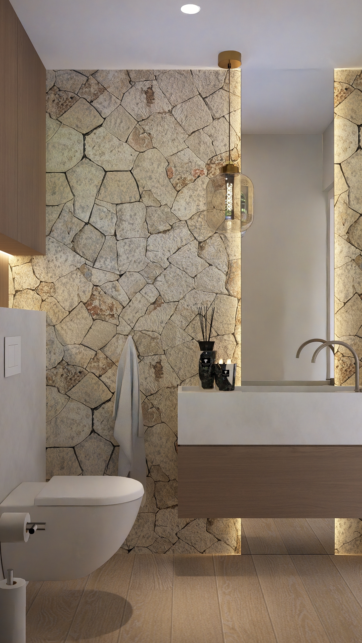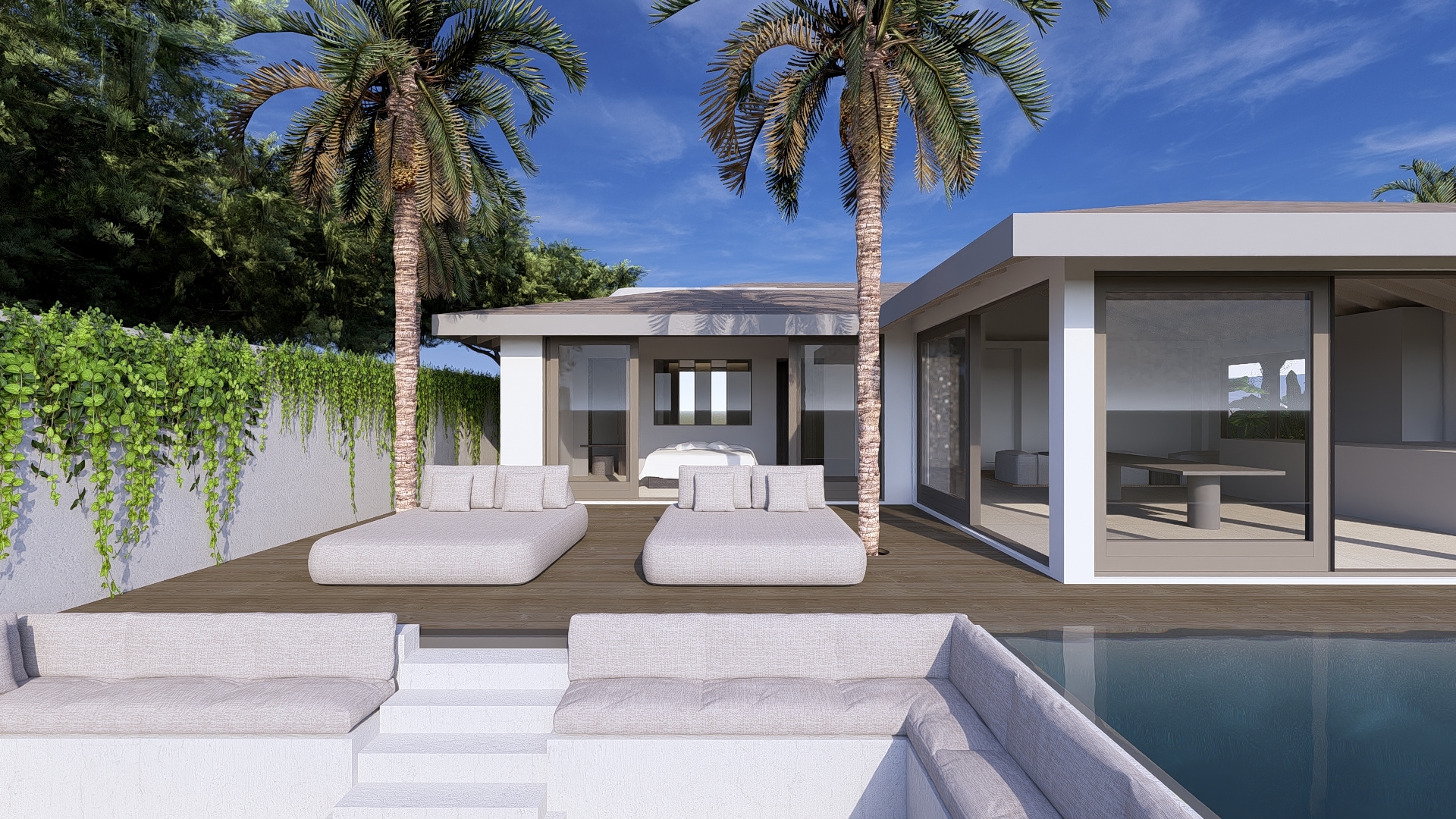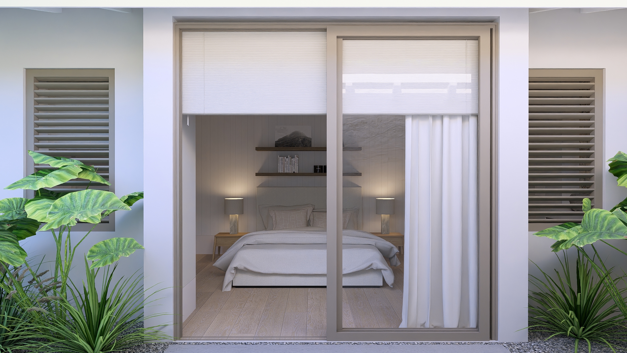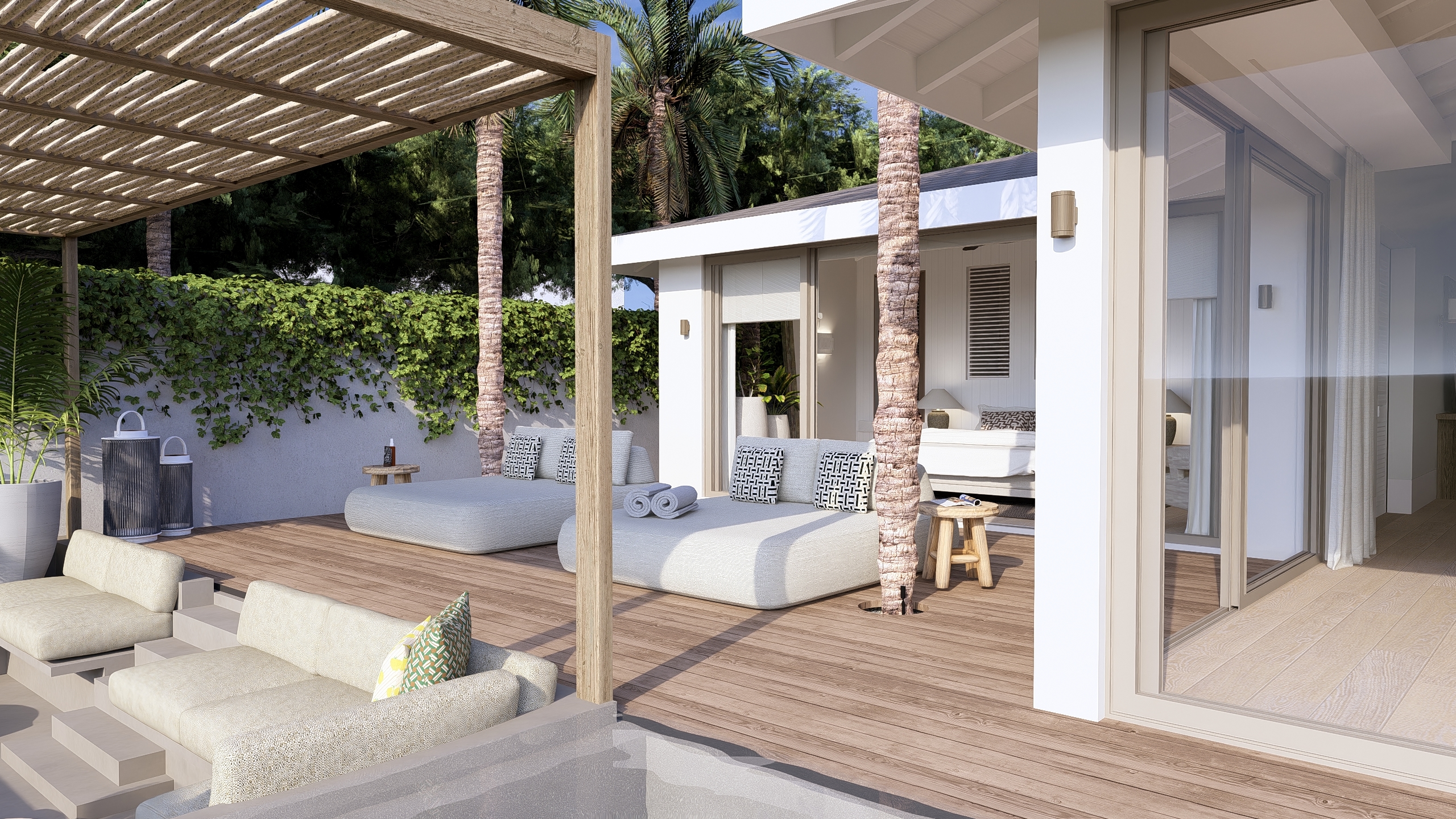 Natuurlijke materialen zoals hout, linnen en rotan vormen de basis van het ontwerp en worden gecombineerd met een palet van zachte zandtinten, helder wit en koele oceaanblauwe accenten. Grote raampartijen en open leefruimtes zorgen voor een vloeiende overgang tussen binnen en buiten, waardoor daglicht en de verkoelende zeebries vrij spel krijgen.