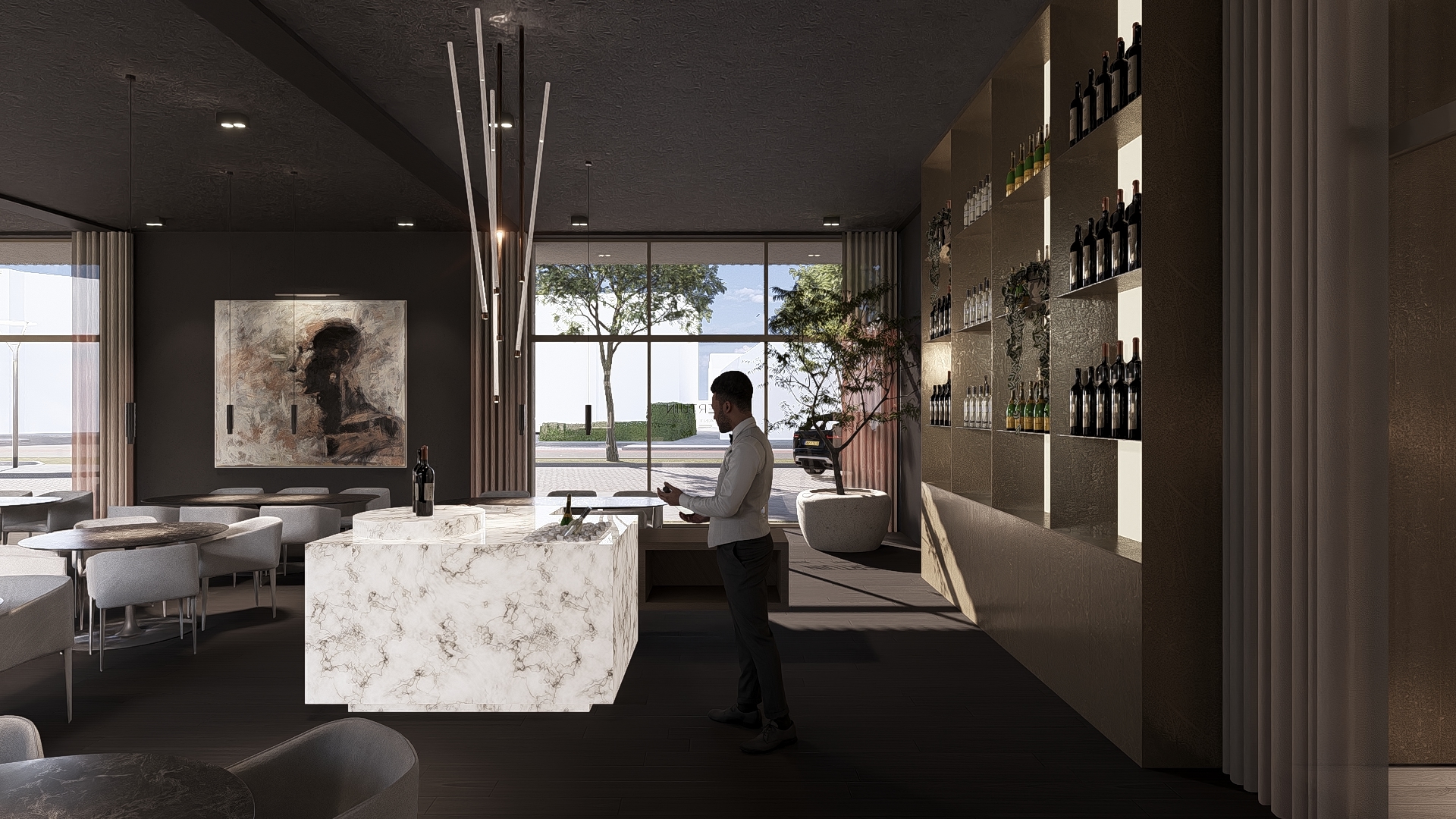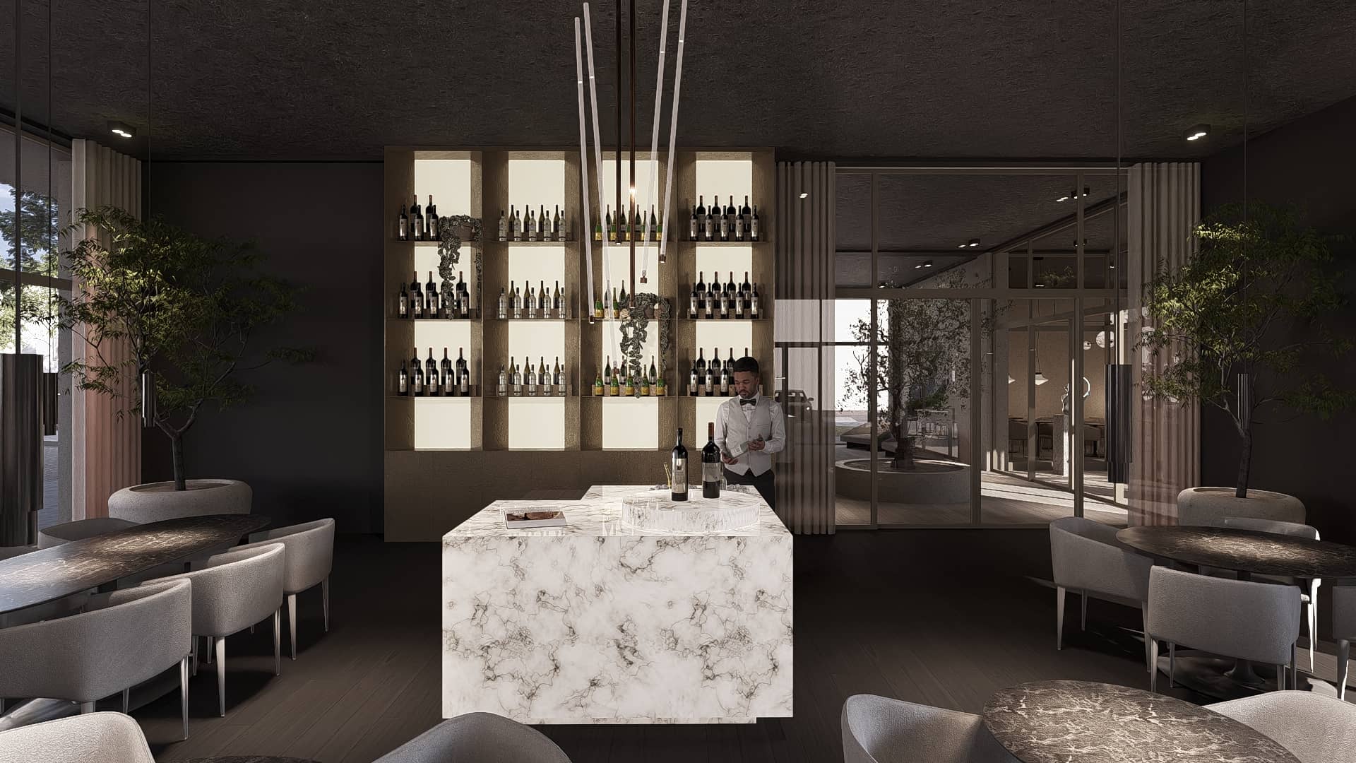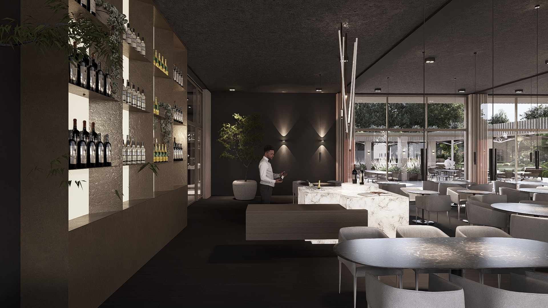 Het interieur speelt met contrasten tussen licht en donker, openheid en intimiteit. De bar ademt lichtheid en elegantie, met verfijnde materialen en uitgesproken verlichting die ontmoeting stimuleren. In het restaurant keert de sfeer naar ingetogen en warm, met donkere tinten en een focus op het eten. Een uitgelichte wijnpresentatie en zicht op de open keuken versterken de beleving zonder te overheersen.
