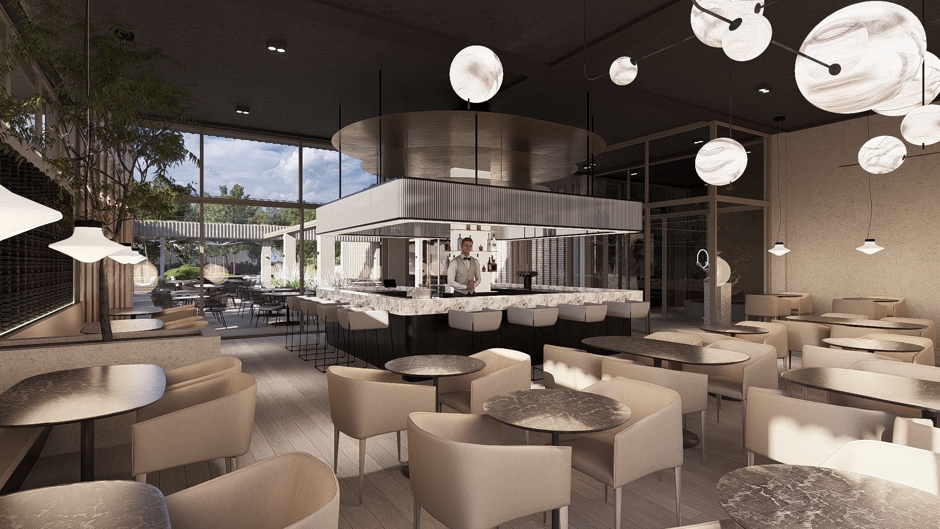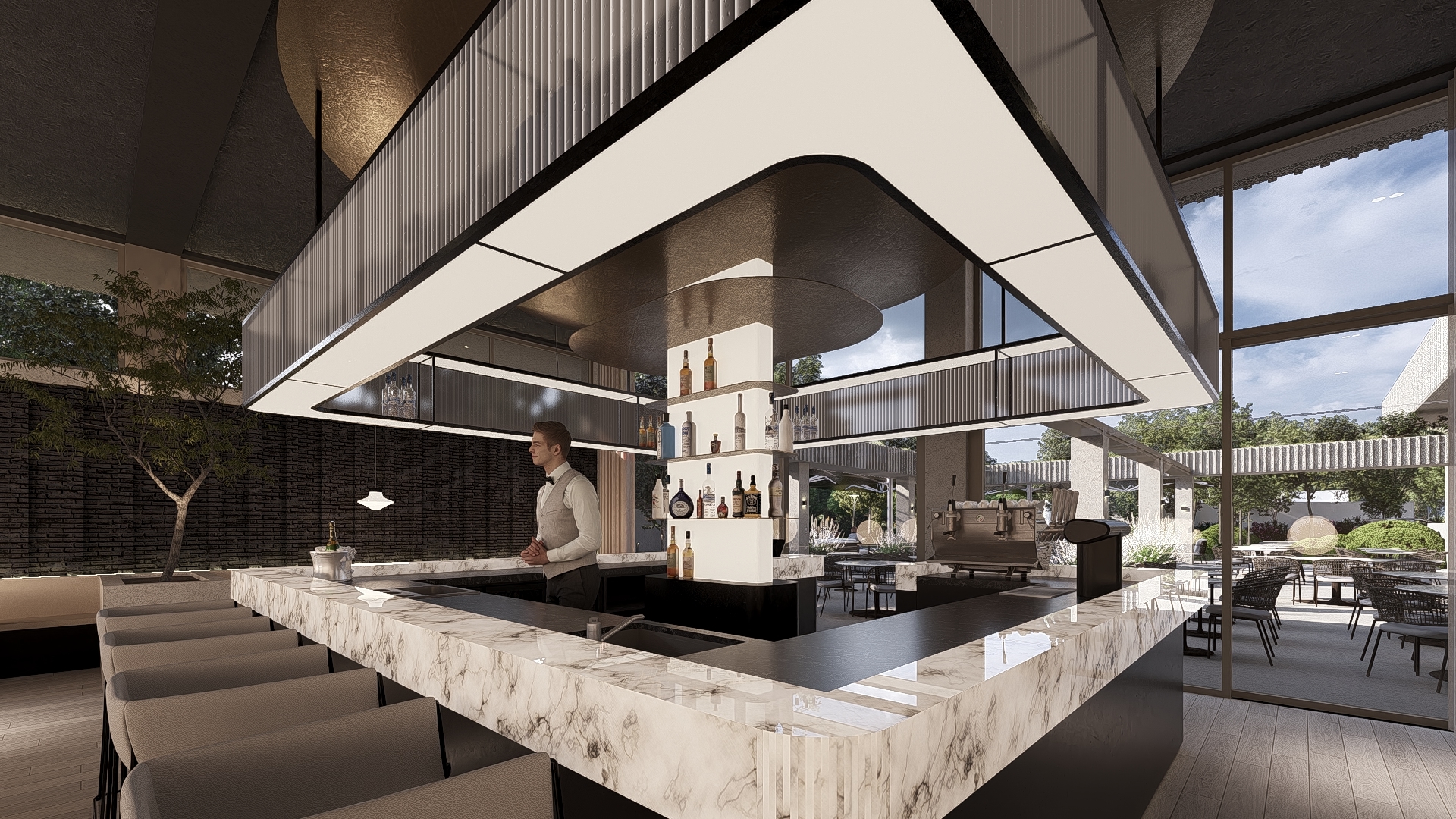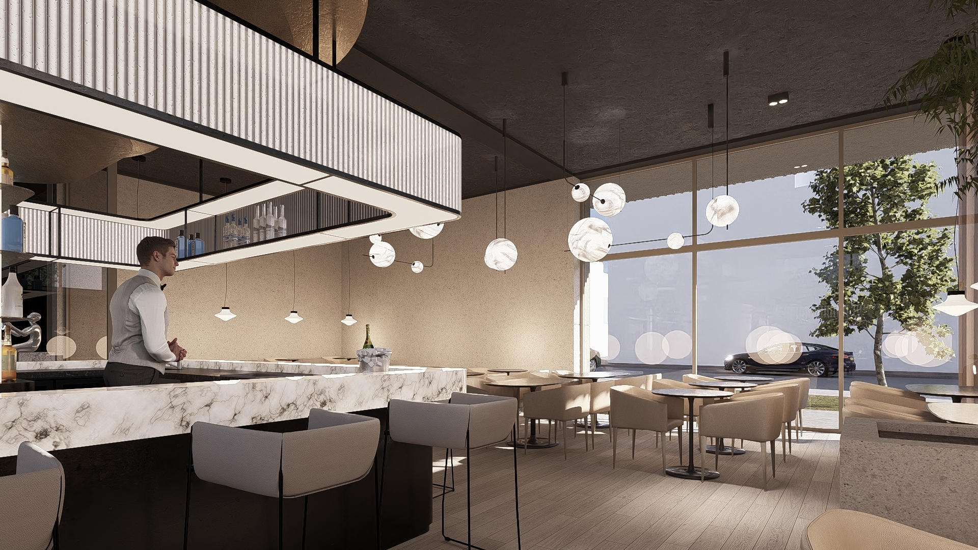 Het interieur speelt met contrasten tussen licht en donker, openheid en intimiteit. De bar ademt lichtheid en elegantie, met verfijnde materialen en uitgesproken verlichting die ontmoeting stimuleren. In het restaurant keert de sfeer naar ingetogen en warm, met donkere tinten en een focus op het eten. Een uitgelichte wijnpresentatie en zicht op de open keuken versterken de beleving zonder te overheersen.