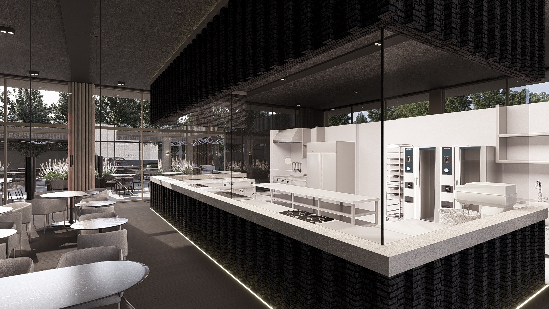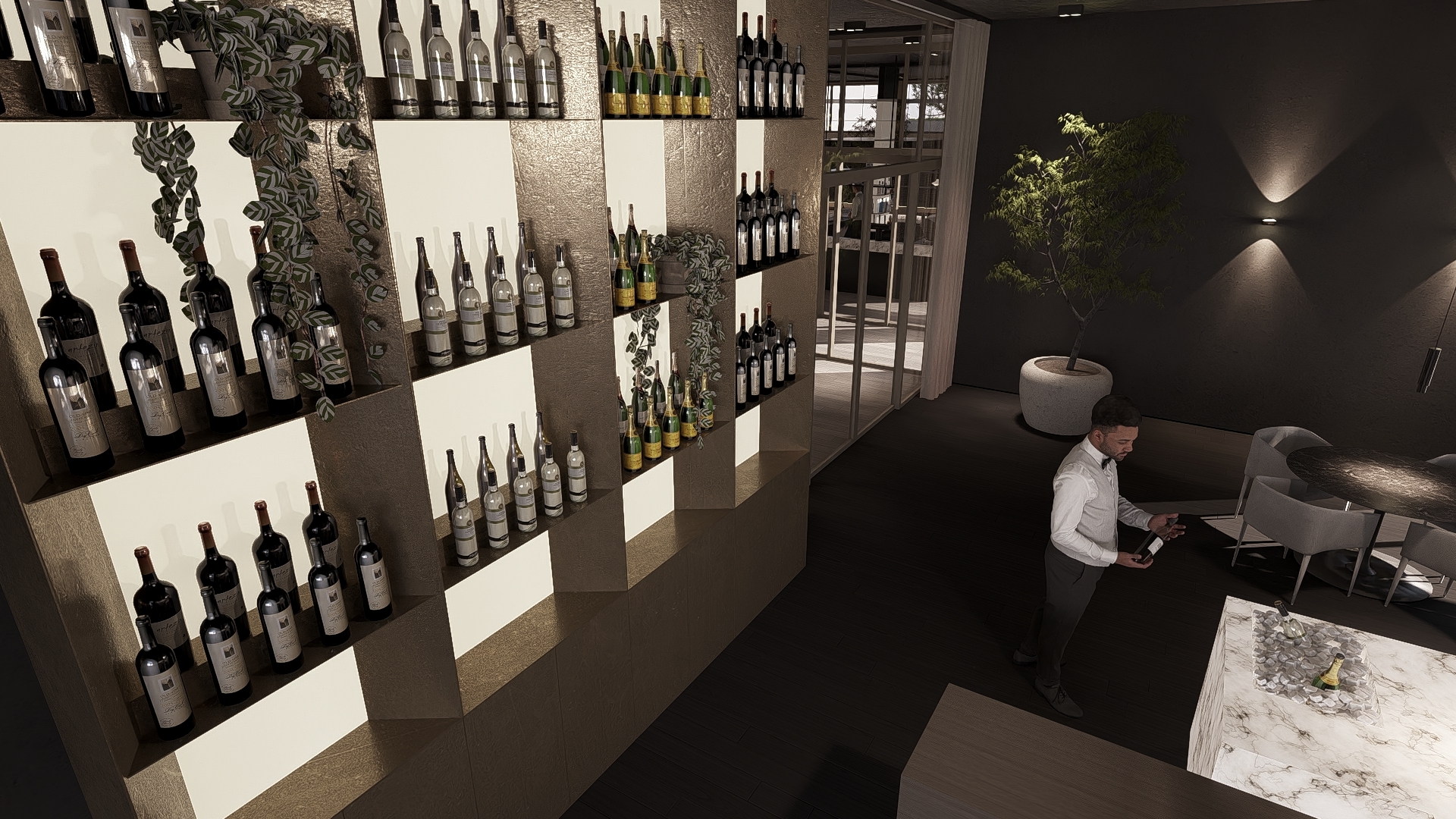 In tegenstelling tot de bar, heeft het restaurant een meer ingetogen en donkere sfeer. Hier verschuift de aandacht naar wat echt telt: het eten. Een subtiel lichtplan verlicht de tafels afzonderlijk, zodat de focus volledig op de gerechten komt te liggen. De omgeving blijft rustig, met één opvallend element als eyecatcher: een elegante presentatie van de meest verfijnde wijnen. De open keuken biedt een blik op hoe de gerechten worden bereid, een kijkje door de ogen van de chef.